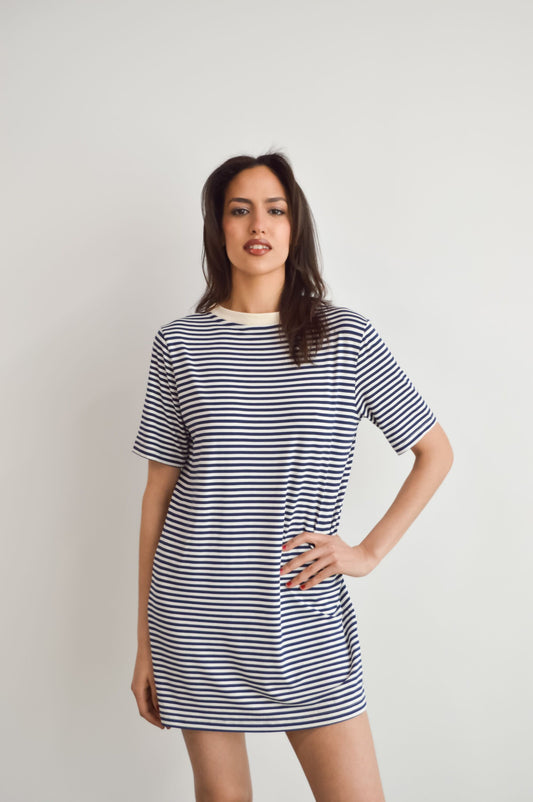 Marina - Robe t-shirt lignée en bamboo bleu marine à col rond